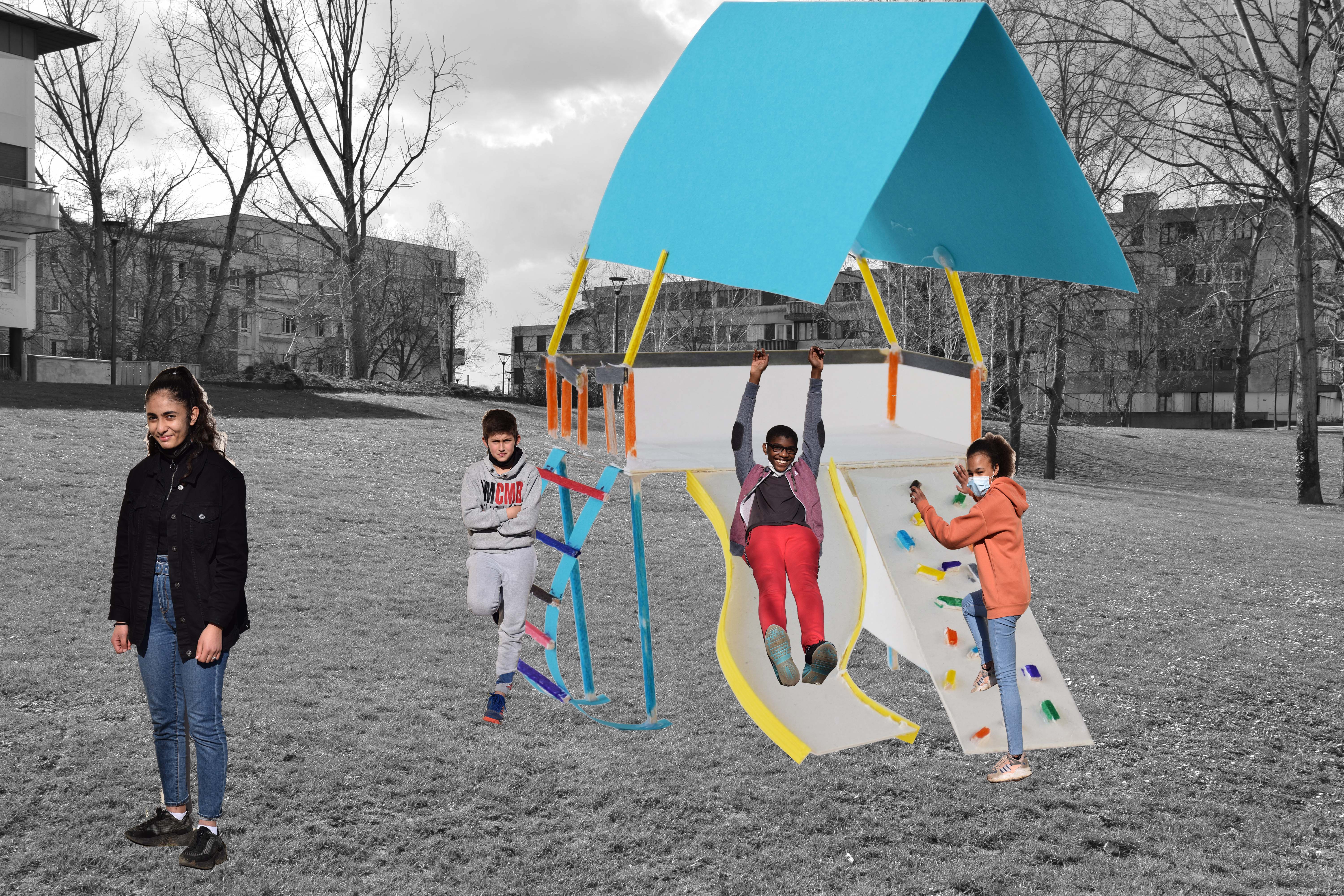 La synthèse des travaux de conception donna deux esquisses, que les enfants devais, en principe, présenter lors d’un conseil municipal, en raison des mesures sanitaires, cet phase n’a pas pu être concrétisé.