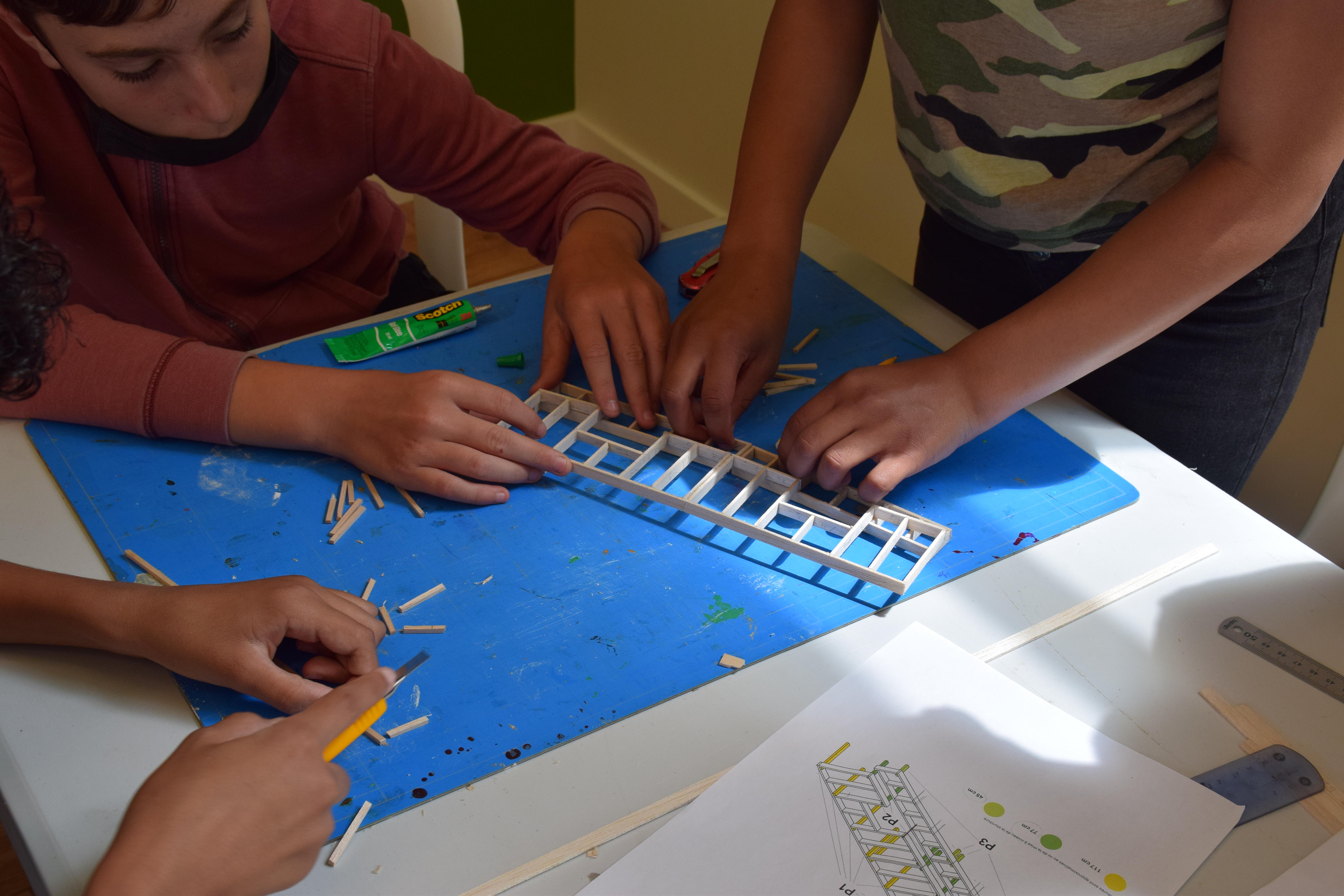 Le premier jour est celui des receptions de commandes, celle-ci n’arrivent jamais au bon moment ou même pas du tout. Nous profitons de ces moments d’imprévus pour revenir à la maquette. Ce jour “perdu” fu bien plus bénéfique que nous l’imaginions ; les enfants semblent prendre confiance dans la compréhension de la structure, des divers materiaux et techniques d’assemblages.